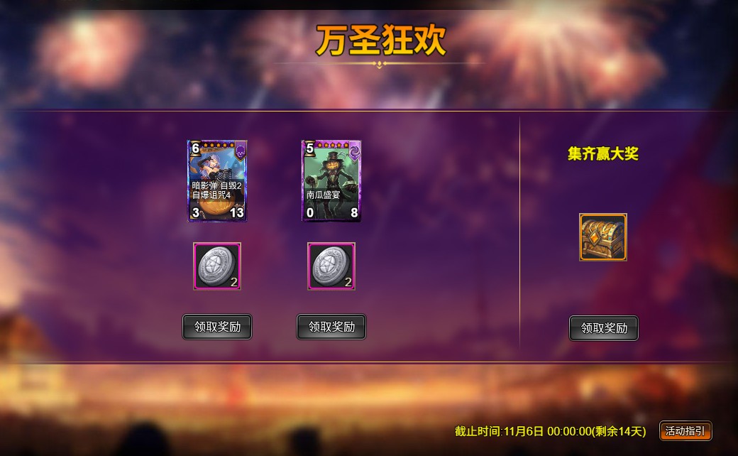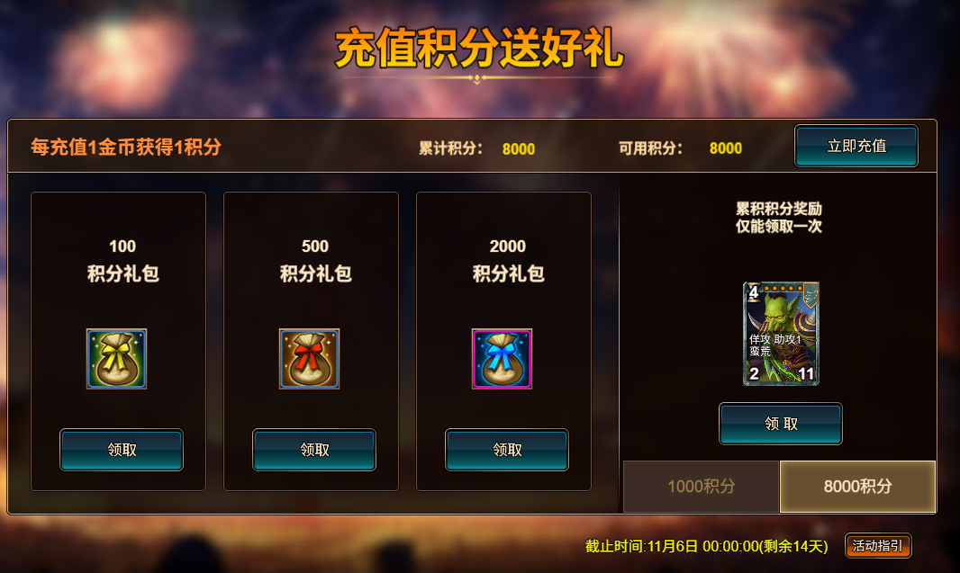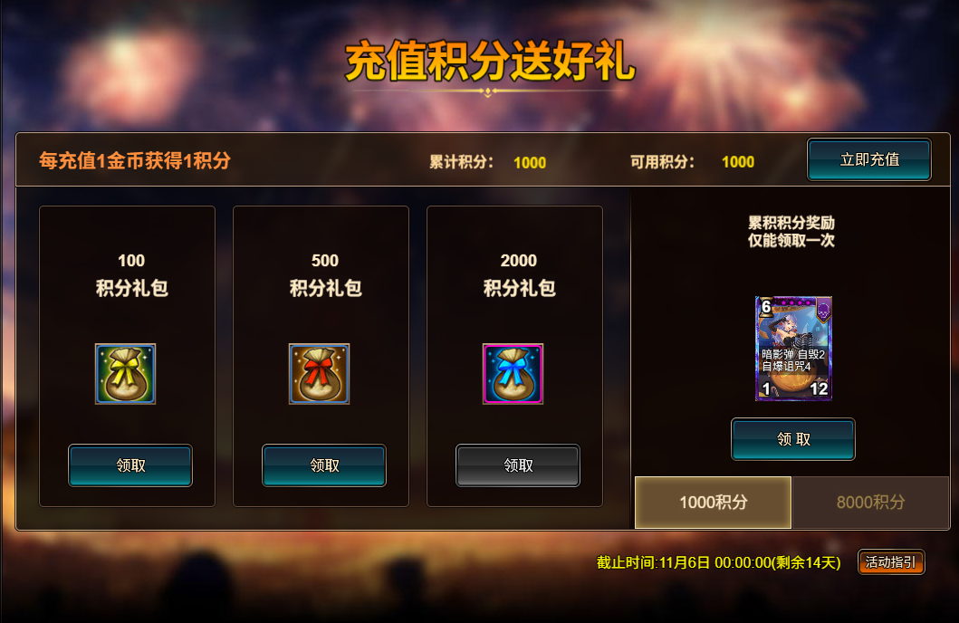 1. 充值积分送好礼:1,000 - 南瓜魔女迪妮芙(史诗)/ 8,000 - 突袭队长麻脸(传说)