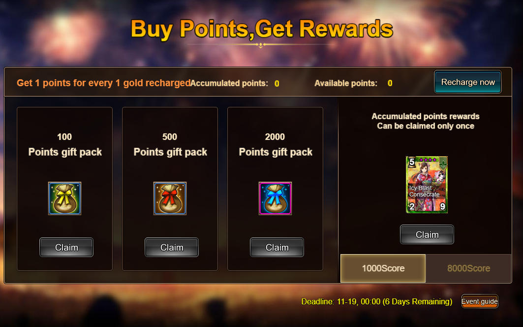 1. Buy Points. Get Rewards:1,000 -High Lady Kuri(Epic)/8,000 - Smouldering Nelly(Legendary)