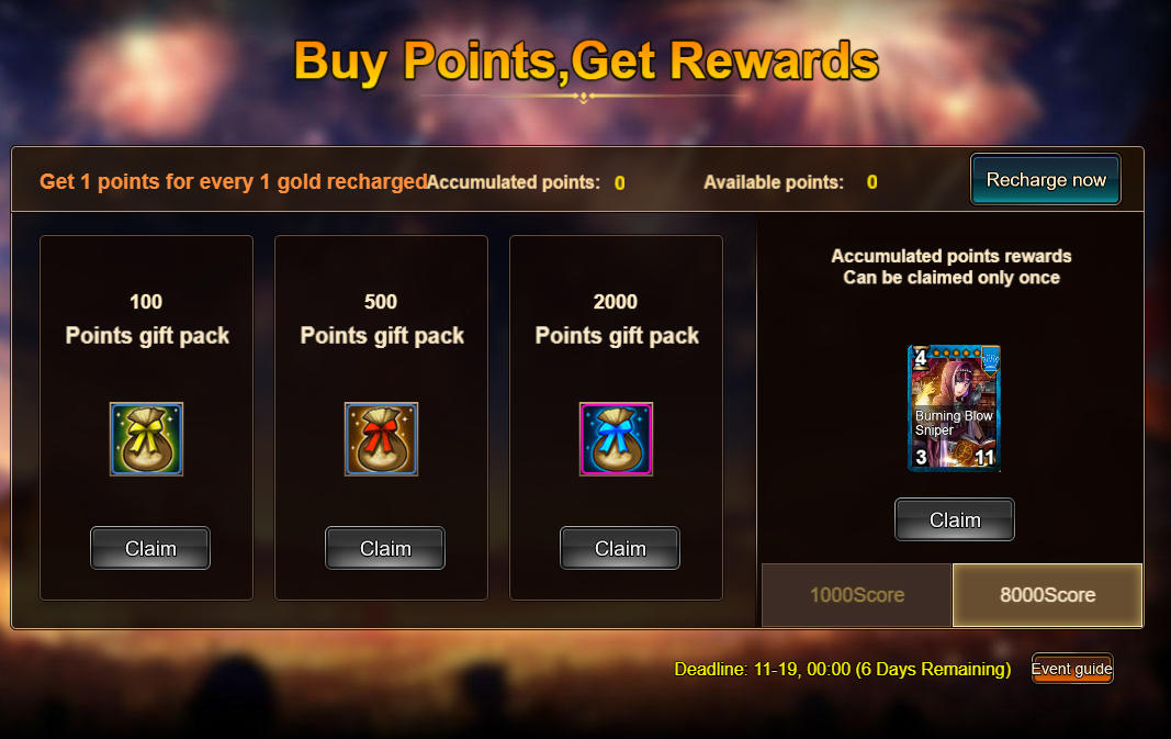 1. Buy Points. Get Rewards:1,000 -High Lady Kuri(Epic)/8,000 - Smouldering Nelly(Legendary)