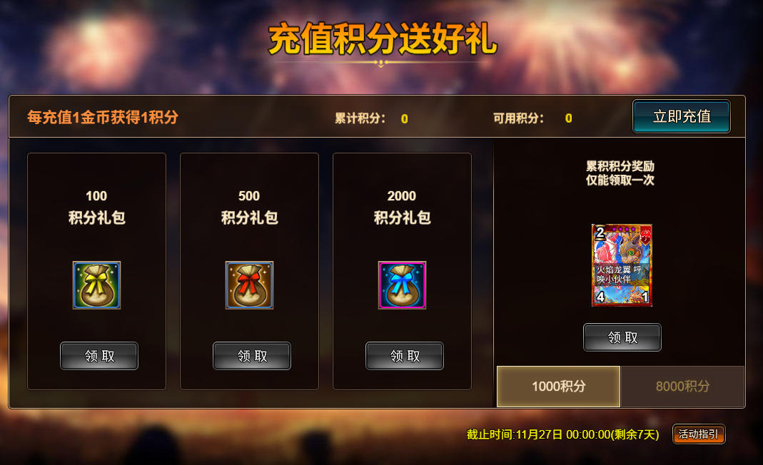 1. 充值积分送好礼:1,000 - 火焰龙宝宝(史诗)/ 8,000 - 祭月之兔露娜(传说)