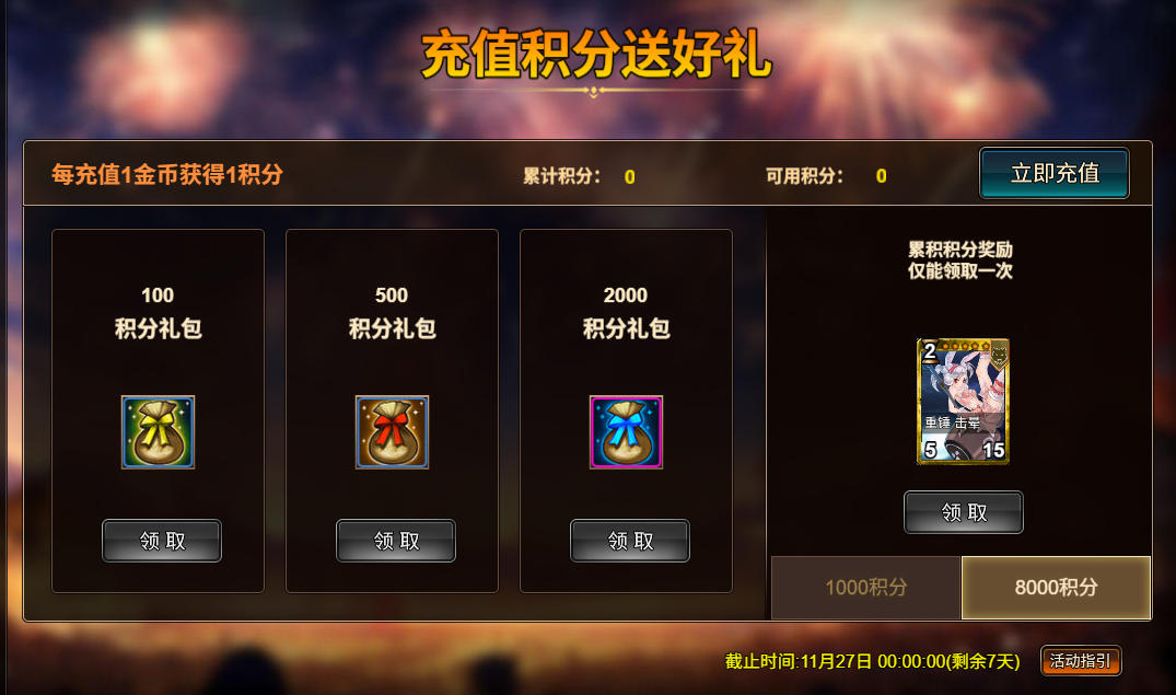 消费10000金币:橙卡卡盒*1,银币*1,000,000