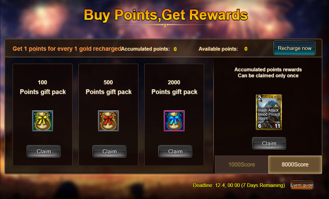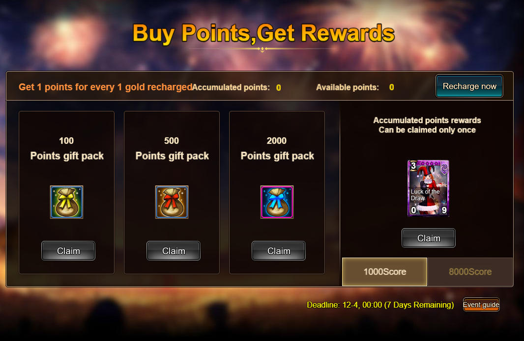 1. Buy Points. Get Rewards:1,000 - Harlequin(Epic)/8,000- Nemesis Nahaul(Legendary)