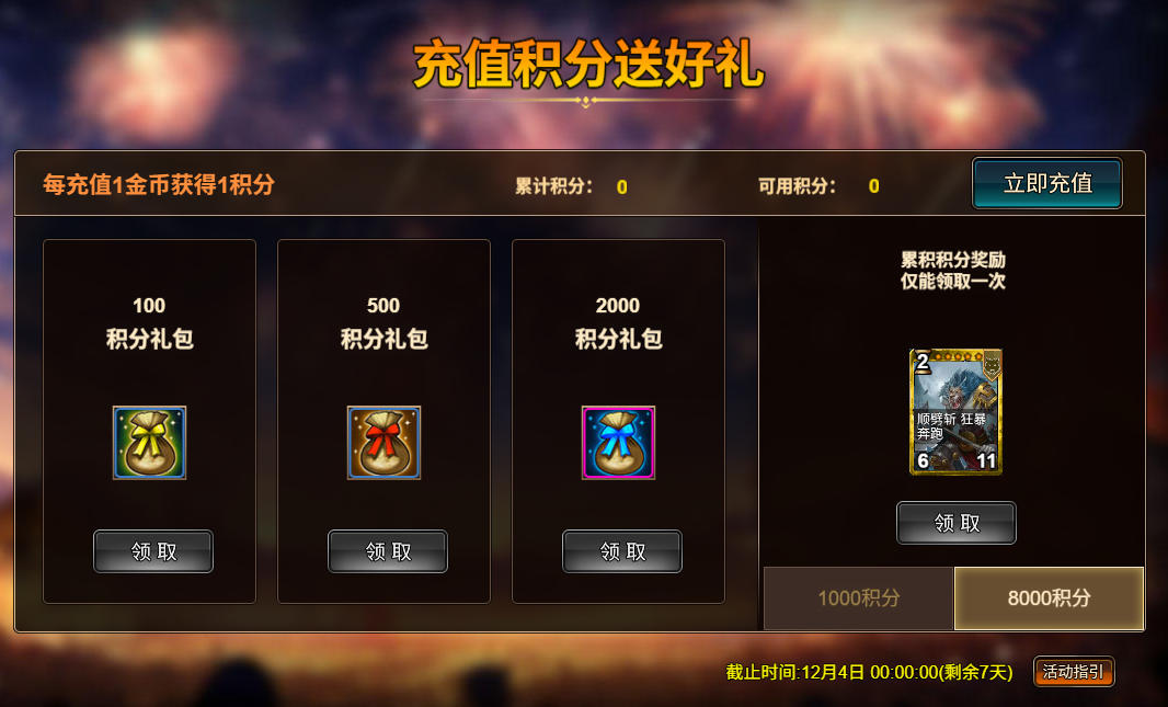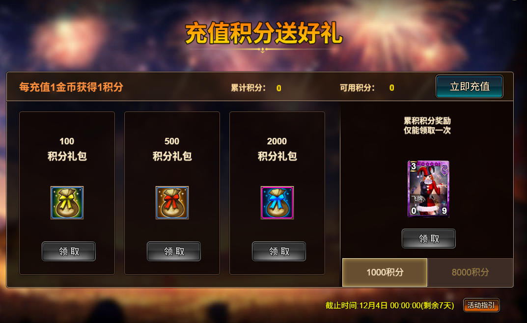 1. 充值积分送好礼:1,000 - 小丑莱杰(史诗)/ 8,000 - 冷斧吴刚(传说)