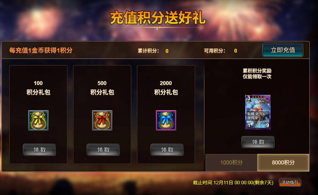 1.充值积分送好礼:1,000 - ARK道士(史诗)/ 8,000 - 摩羯座守护星(传说)