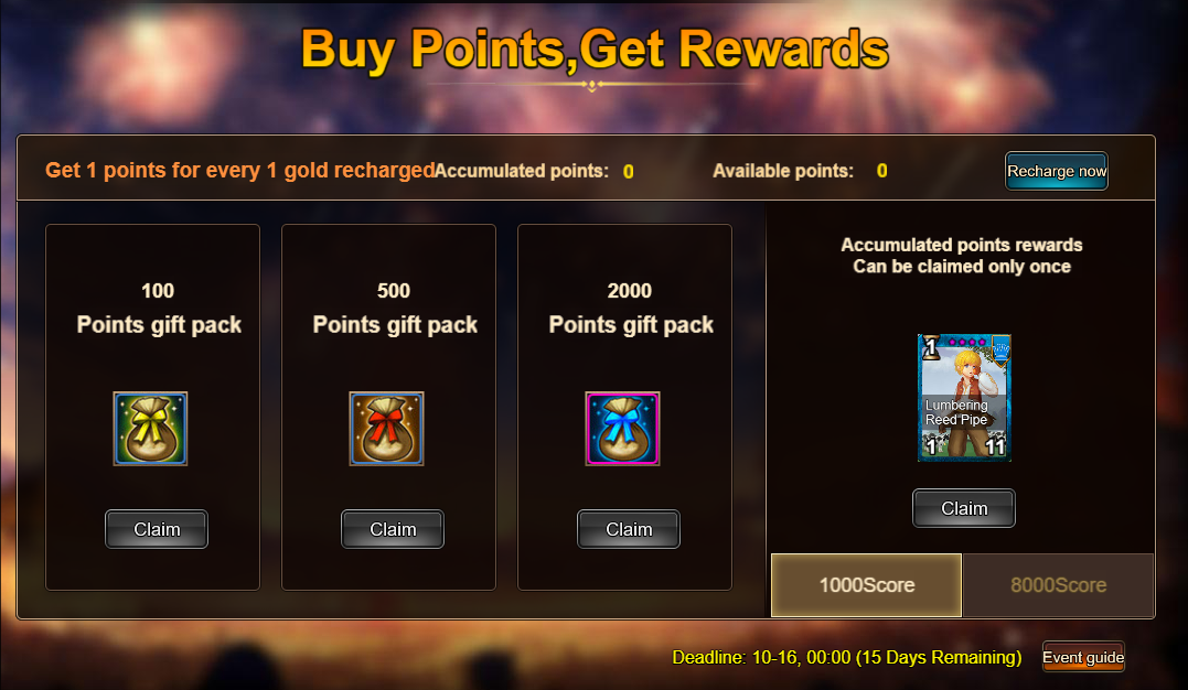 1.Buy Points, Get Rewards: 1000- Farmhand Westley (Epic)*1 / 8000- Ophelia West-Wind (Legendary)*1