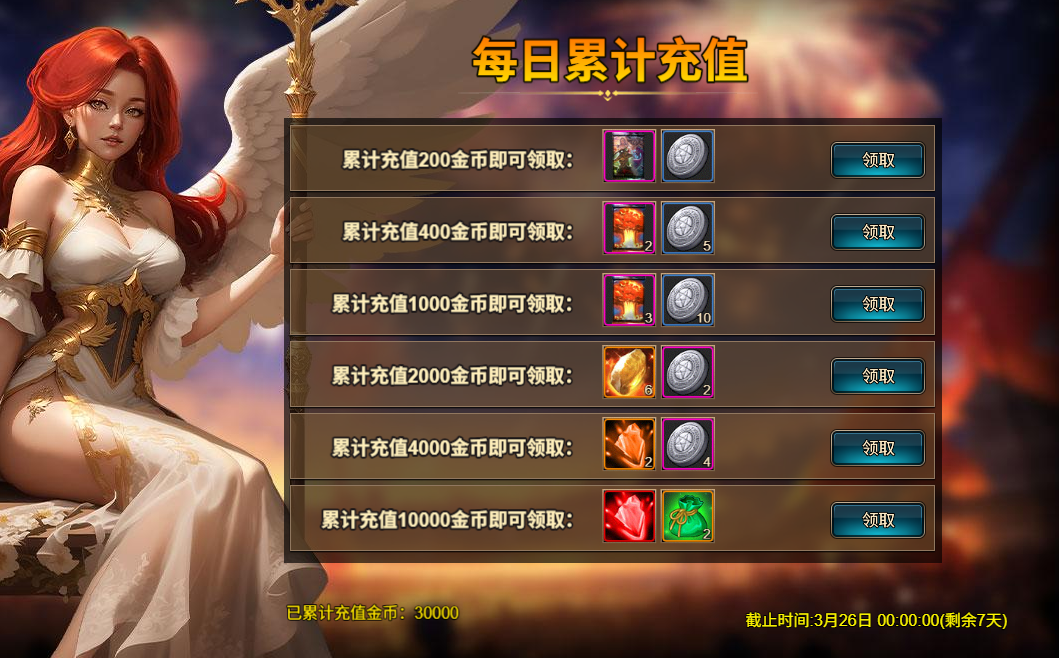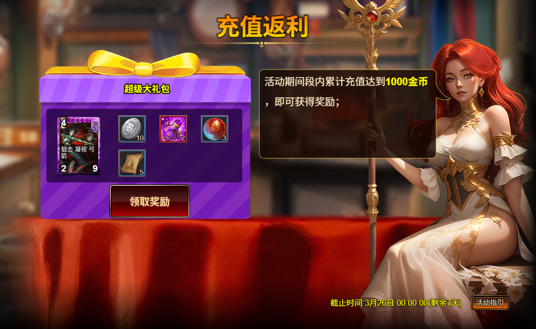 2. 充值送礼:蛇发女妖美杜莎(史诗)*1 / 万圆银币礼包*10 / 魔王药水*2 / 转职水晶*3 / 通天塔门票*5