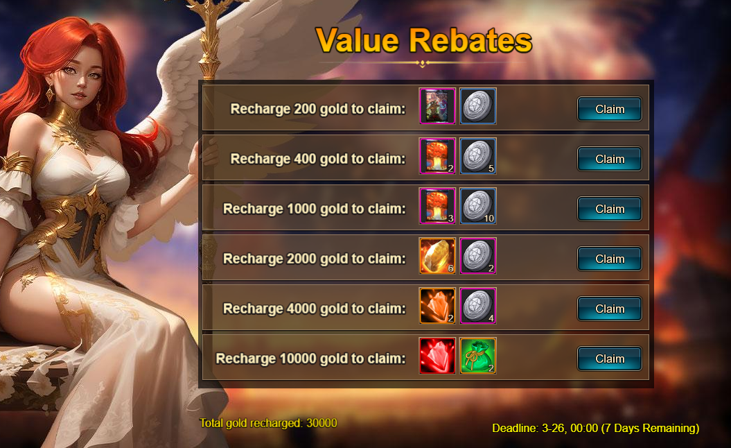 2. Recharge Rebate: Medusa (Epic) / Silver*100,000 / Dark Champion Potion*2 / Class Selection Crystal*3 / Tower Ticket*5