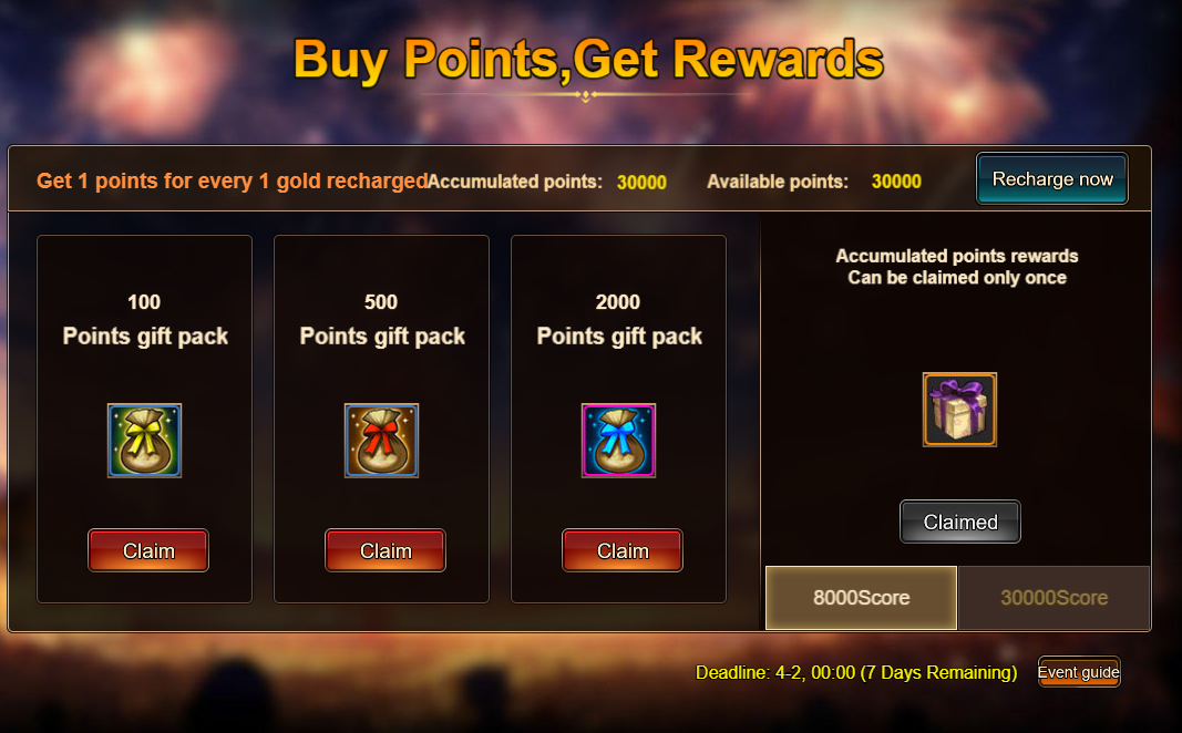 3. Buy Points, Get Rewards: 8000 - Loki Chest (Legendary)*1 / 30000 - Loki Chest (Godlike)*1