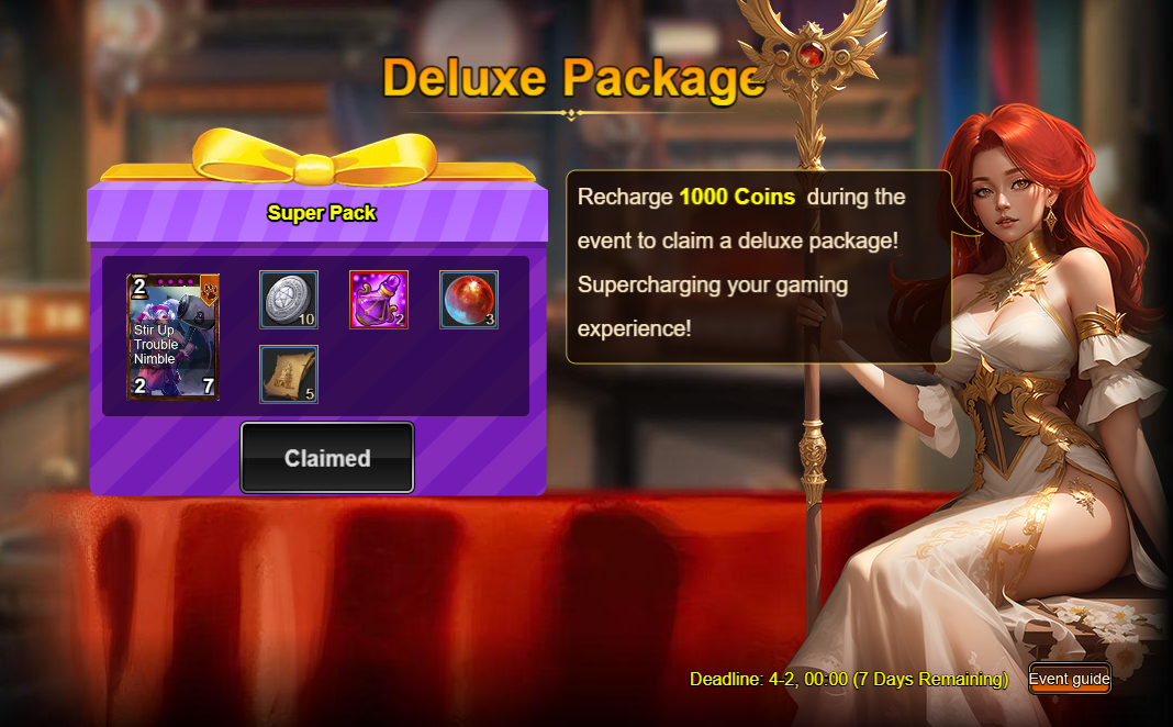 2. Recharge Rebate: Manny the Trickster (Epic) / Silver*100,000 / Dark Champion Potion*2 / Class Selection Crystal*3 / Tower Ticket*5