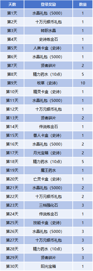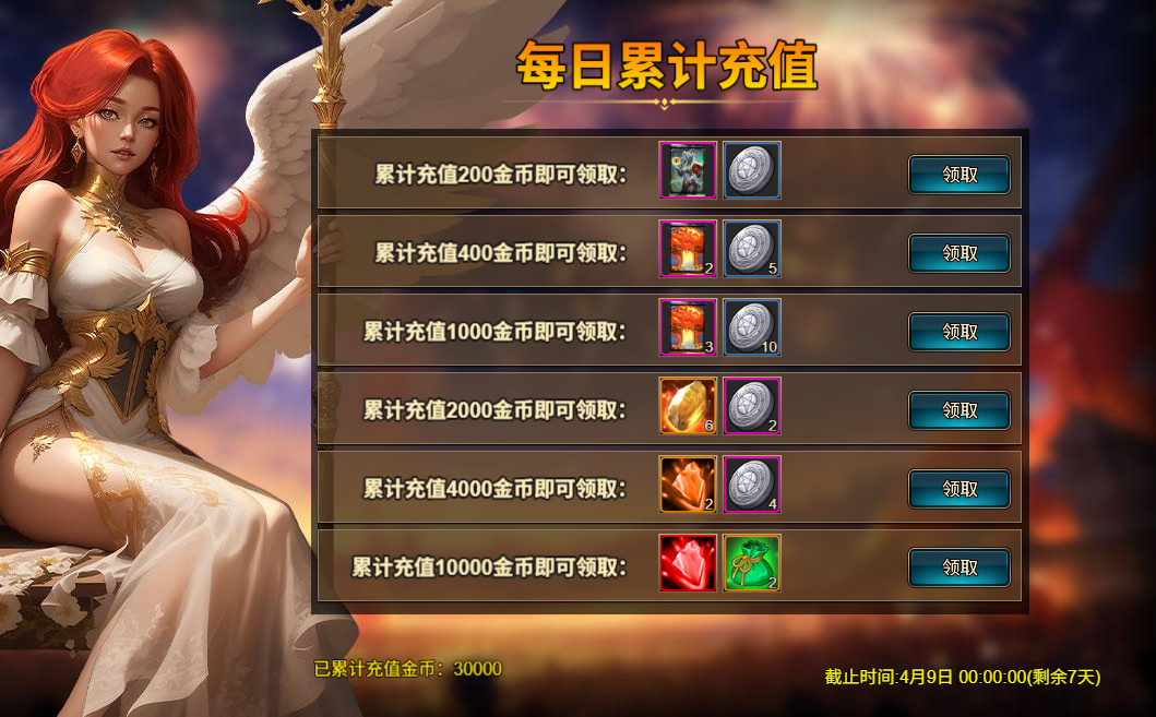 4. 充值送礼:灰眸女神雅典娜(史诗)*1 / 万圆银币礼包*10 / 魔王药水*2 / 转职水晶*3 / 通天塔门票*5