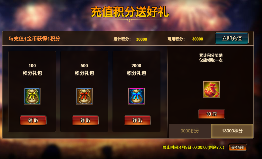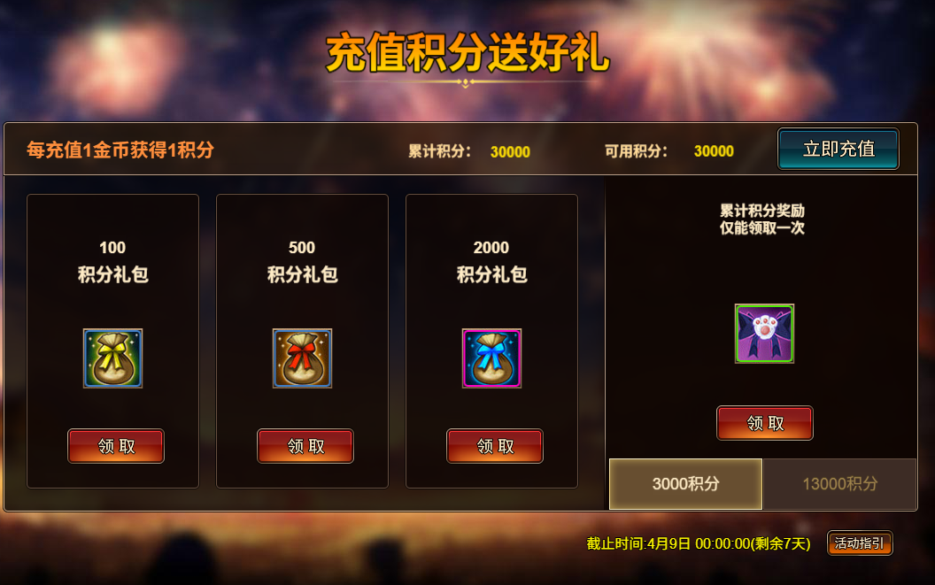 5. 充值积分送好礼:3000 - 萌兔琦服(精良)*1 / 13000 - 萌兔琦服(传说)+ 忠义之灵犬(史诗)*1