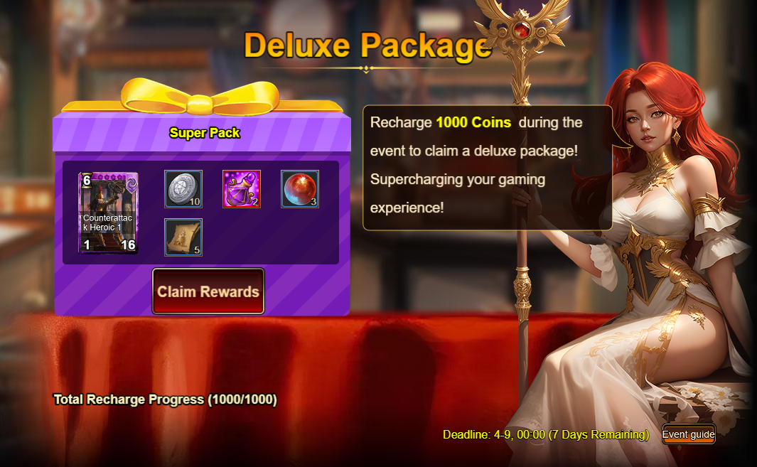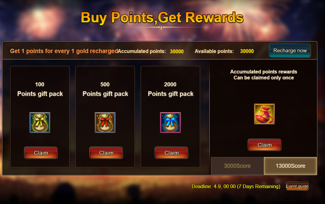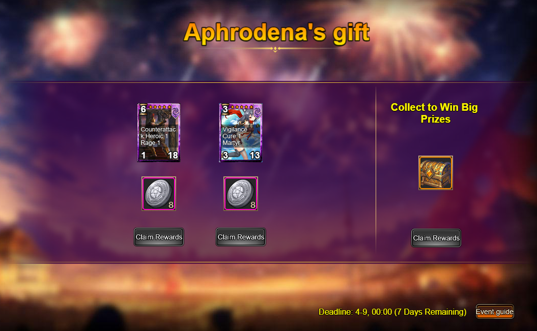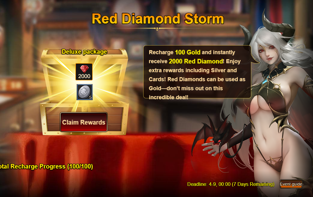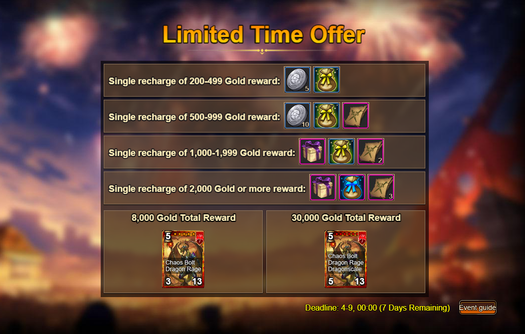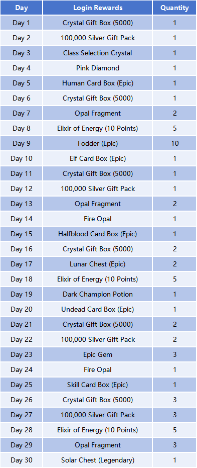 4. Recharge Rebate: Pallas Athena (Epic) / Silver*100,000 / Dark Champion Potion*2 / Class Selection Crystal*3 / Tower Ticket*5