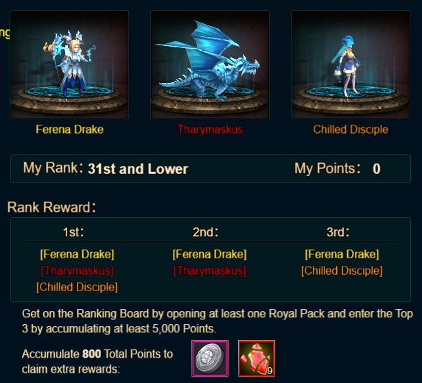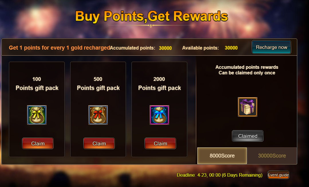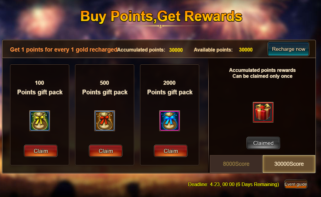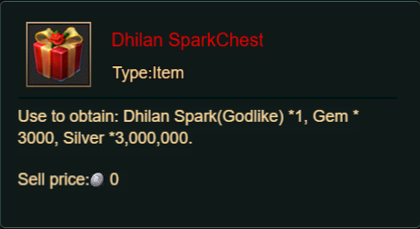 4. Buy Points, Get Rewards: 8000 - Dhilan Spark Chest (Legendary)*1 / 30000 - Dhilan Spark Chest (Godlike)*1
