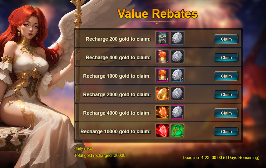 3. Recharge Rebate: 20E Star Little Devil (Epic) / Silver*100,000 / Dark Champion Potion*2 / Class Selection Crystal*3 / Tower Ticket*5