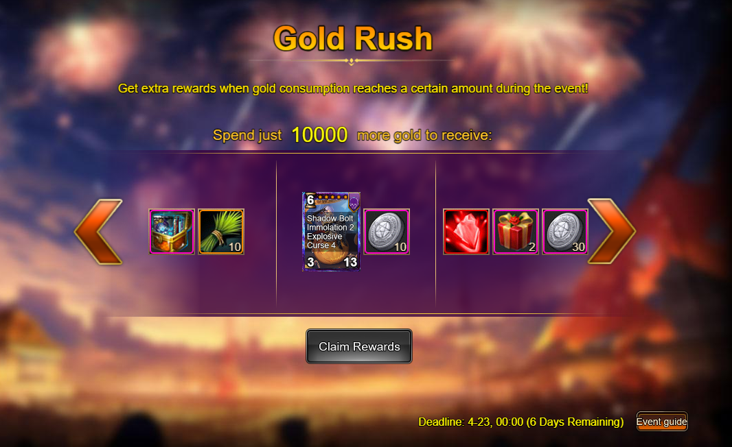 Consume 50,000 gold coins: Black Opal*1, Solar Chest (Legendary)*2, Silver*4,000,000